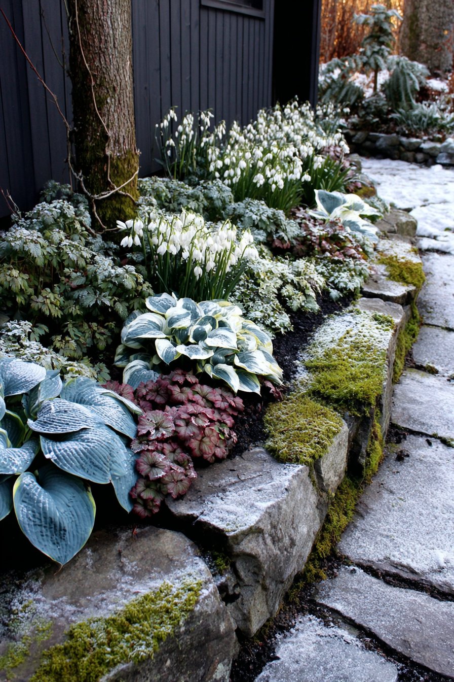 The mix of lush hostas and delicate snowdrops creates a beautiful layered look, perfect for adding depth to any garden. Use contrasting foliage and seasonal blooms to achieve a similar effect, and consider stone borders for a natural touch.