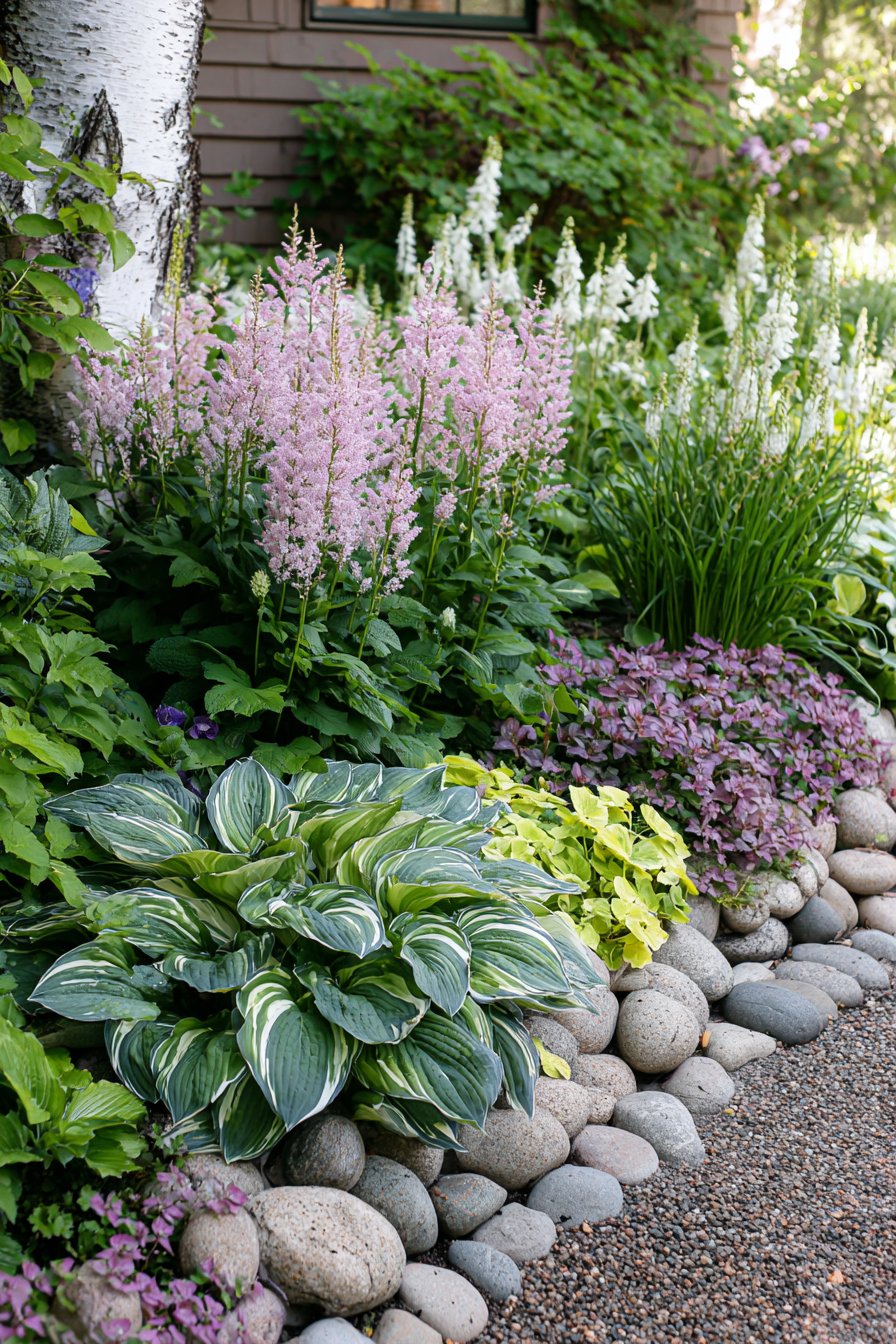 The lush hostas, with their striking variegated leaves, create a beautiful contrast against the delicate white astilbe blooms. For a similar look, mix different hosta varieties with other shade-loving plants and add a layer of ground cover for texture.