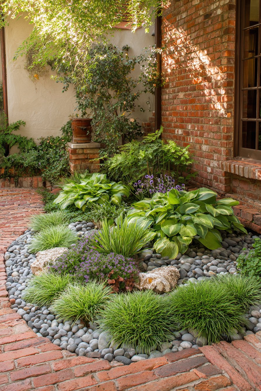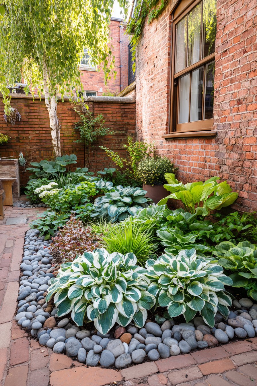 This design features lush hostas paired with contrasting textures from smooth stones and vibrant foliage, creating a serene and inviting space. To mimic this look, choose a mix of hostas, ornamental grasses, and colorful ground covers while using natural stones for borders.
