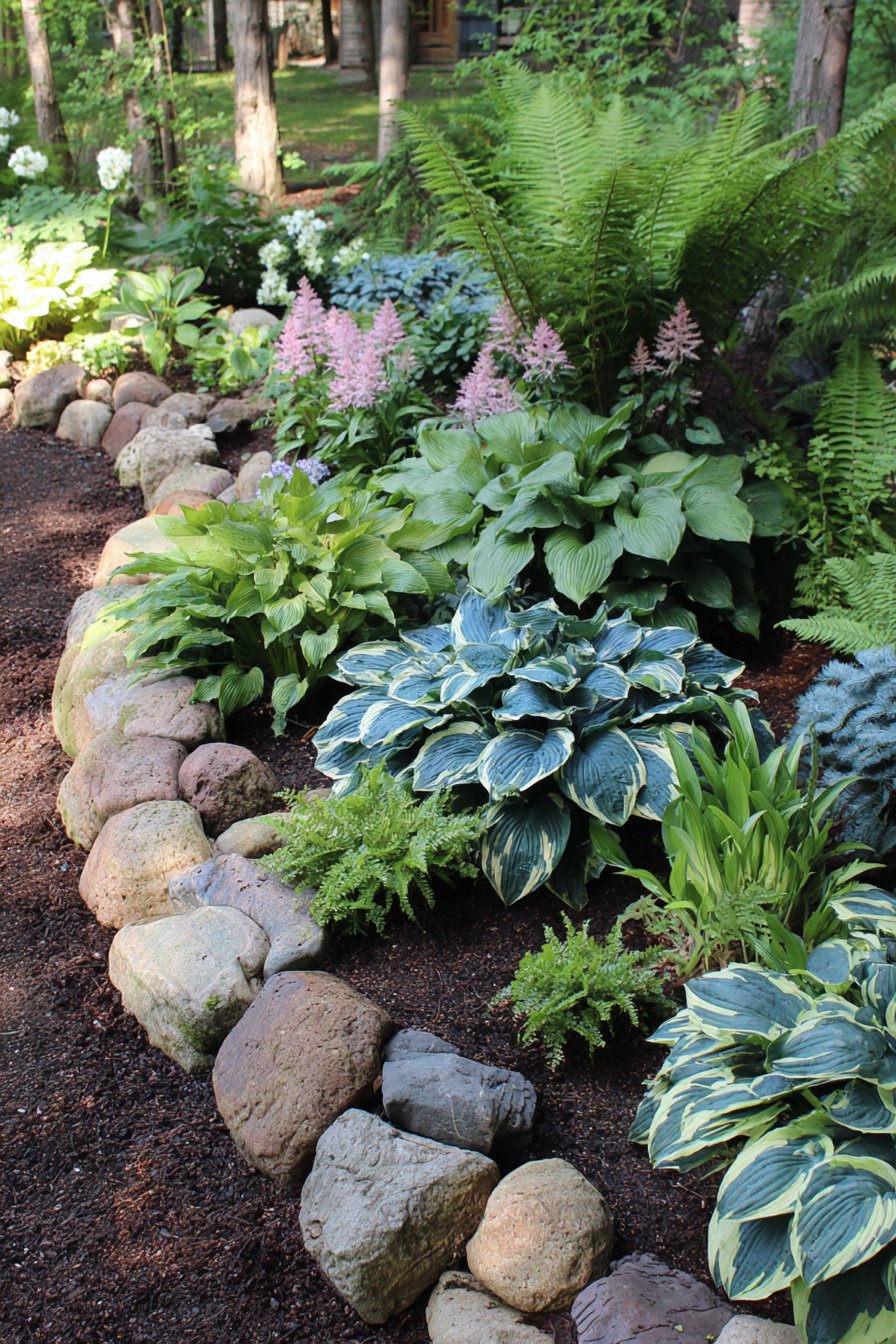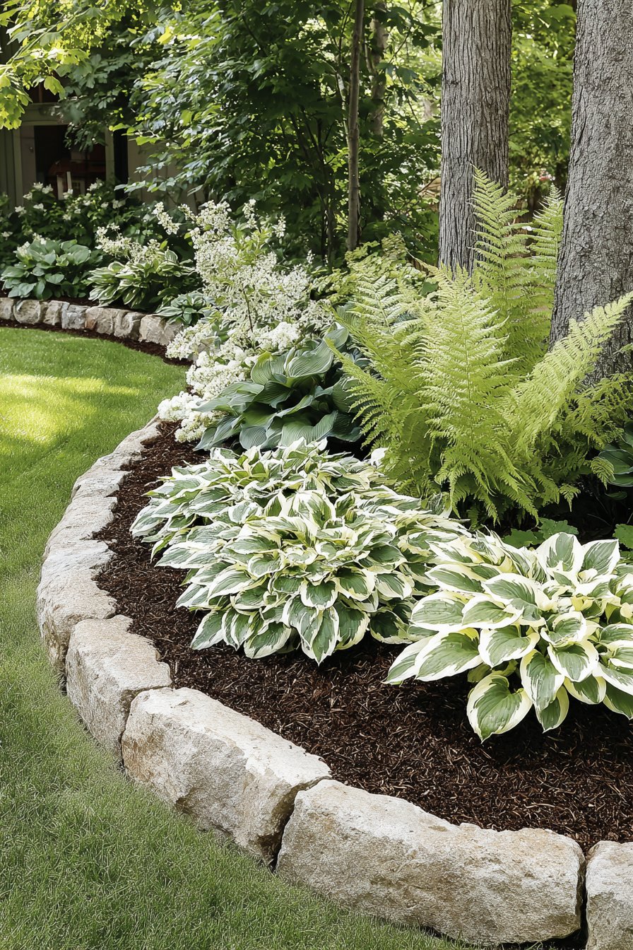 The lush hostas create a stunning display with their vibrant greens and variegated leaves, perfectly complemented by the rustic stone border. To achieve this look, mix different hosta varieties and add ferns for texture, while using stones to define the edges of your garden bed.