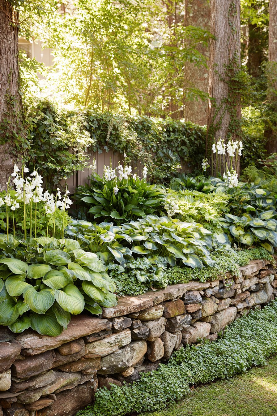 The lush green hostas create a stunning layered effect, while the white flowers add a bright touch that beautifully contrasts with the foliage. To achieve this look, mix hostas with low-growing ground covers and consider using natural stone for a rustic edge.