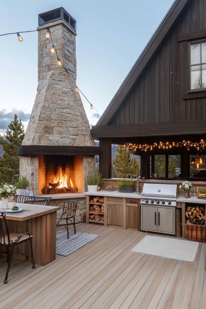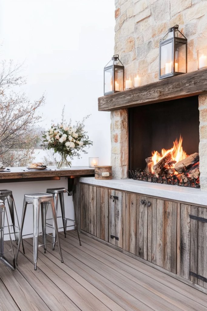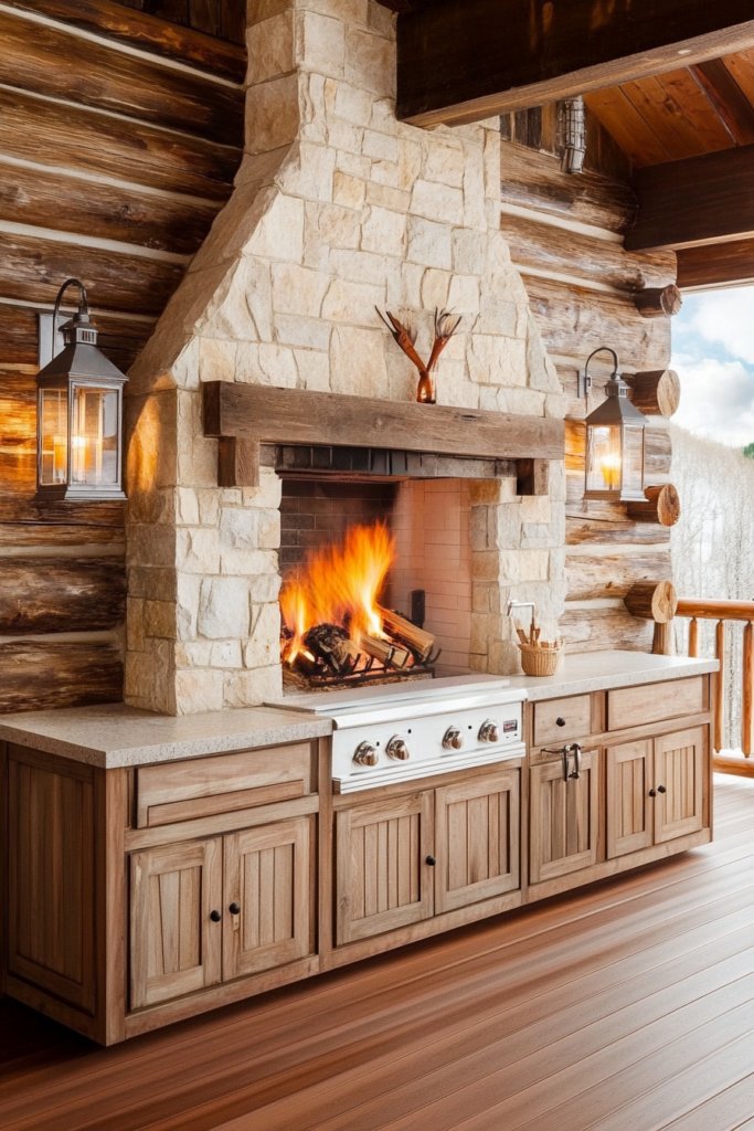 A cozy outdoor space with a natural stone fireplace, wooden cabinetry, and lantern sconces. Warm, earthy tones and rustic charm make it perfect for cabin living. Use distressed wood and warm lighting to enhance the cozy ambiance.