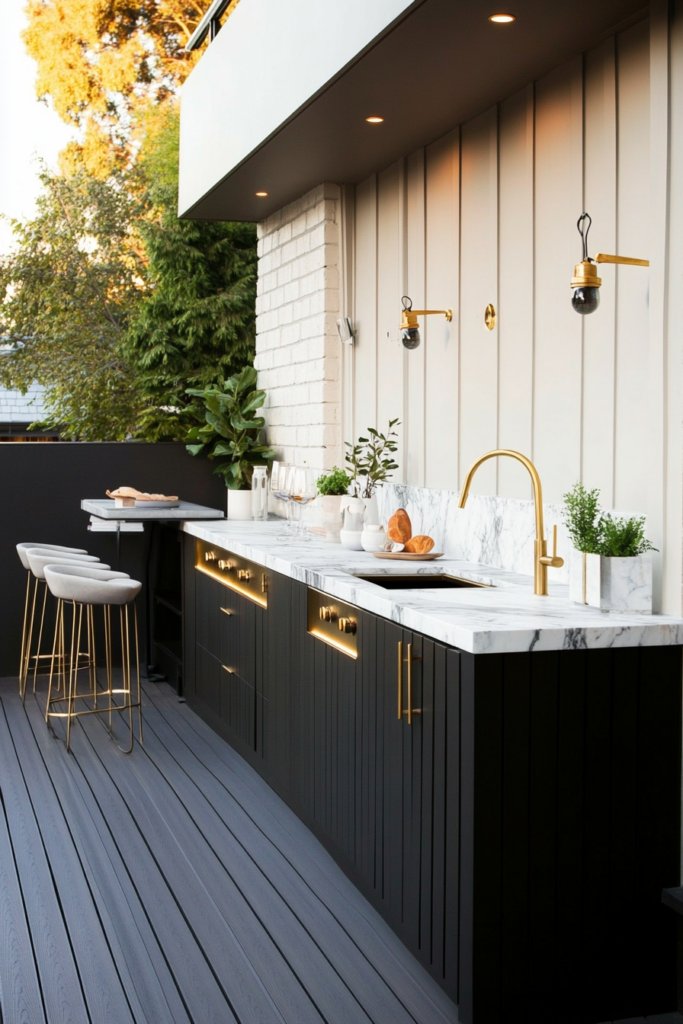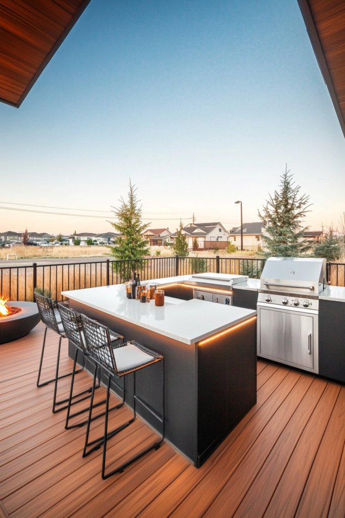 A modern wooden deck with stainless steel appliances, quartz countertops, and LED strip lighting. A fire pit nearby adds warmth, while a black-and-white palette keeps it sleek. Use minimalist bar seating for a polished look.