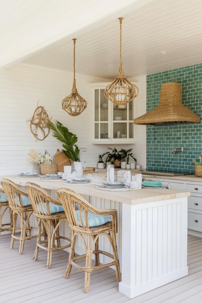 A light oak deck with white-washed cabinets, a turquoise tile backsplash, and rattan bar stools creates a breezy, coastal feel. Complete the look with woven textures, blue accents, and beachy decor elements.