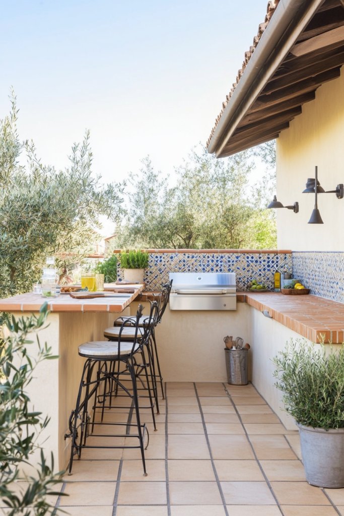 A refined space with terracotta countertops, mosaic tile accents, and wrought iron bar stools. Olive trees and warm beige-blue tones enhance the Tuscan-inspired atmosphere. Incorporate natural stone and clay for authenticity.