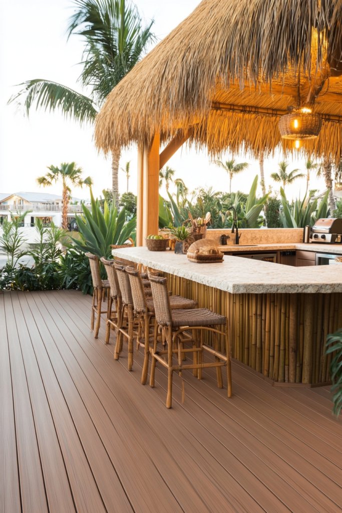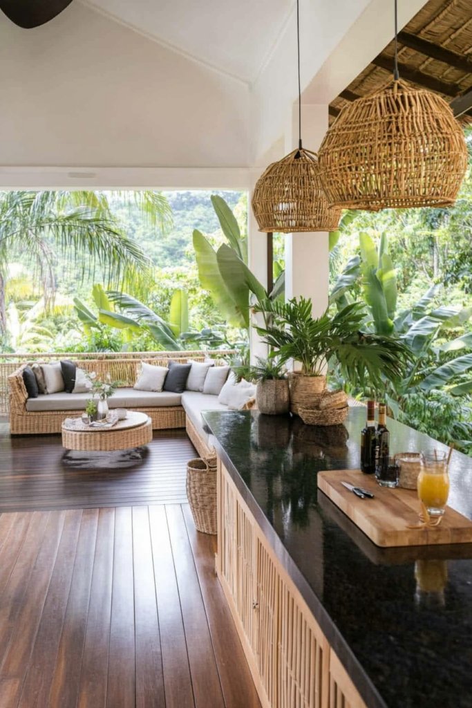 A tropical hardwood deck surrounded by lush jungle greenery. Dark stone countertops, handwoven bamboo pendant lights, and cozy lounge seating create an exotic retreat. Use tropical plants and natural materials for a serene escape.