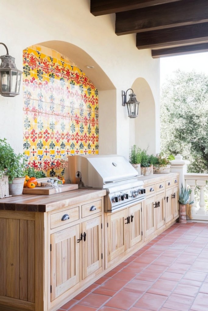 A lively outdoor kitchen with hand-painted tile backsplashes, warm yellow and red tones, and rustic wooden cabinets. Wrought iron details and bold colors complete the festive ambiance. Add hanging lanterns for extra charm.