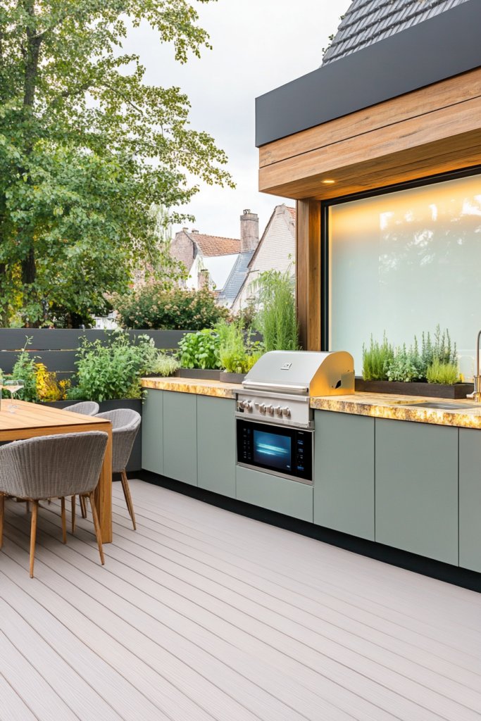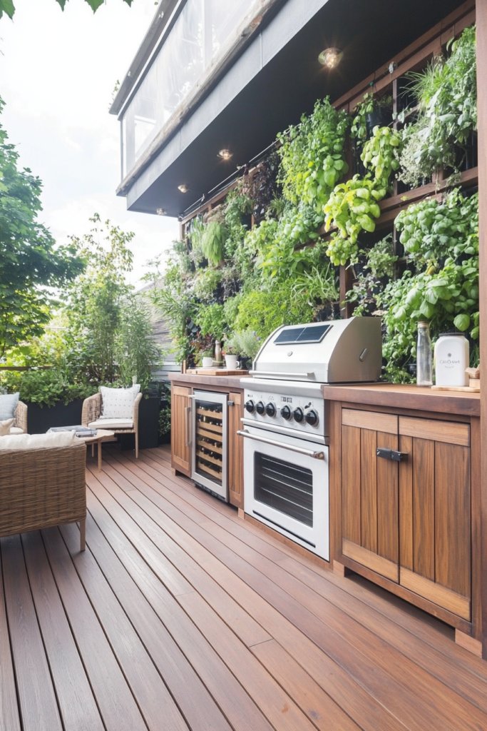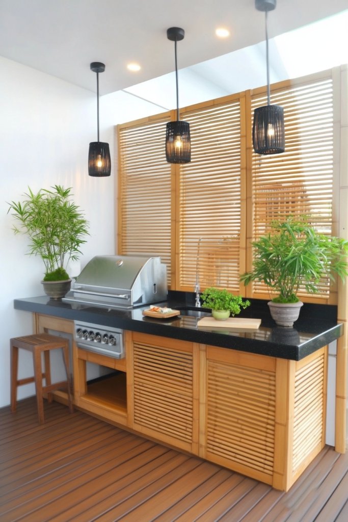A bamboo deck with solar-powered appliances, reclaimed wood cabinetry, and a lush vertical garden. Sustainable materials and earthy tones create a fresh, green retreat. Add natural fiber furnishings for an organic feel.