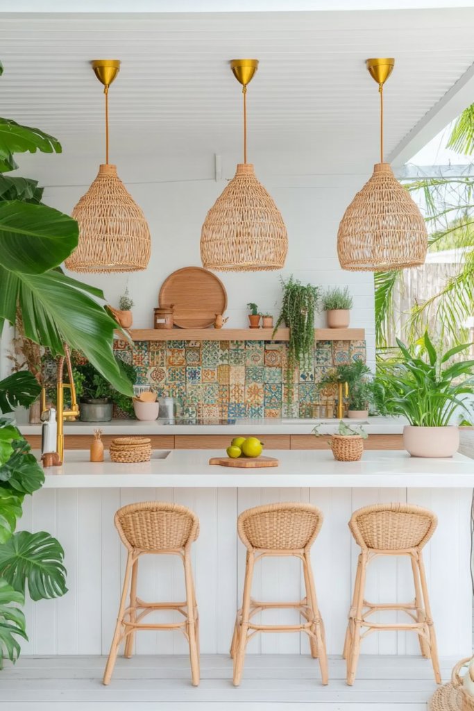 A bright and airy outdoor space with a whitewashed wood deck, golden brass fixtures, and woven pendant lighting. Lush greenery and colorful ceramic tiles add a feel. Enhance with warm, earthy hues.