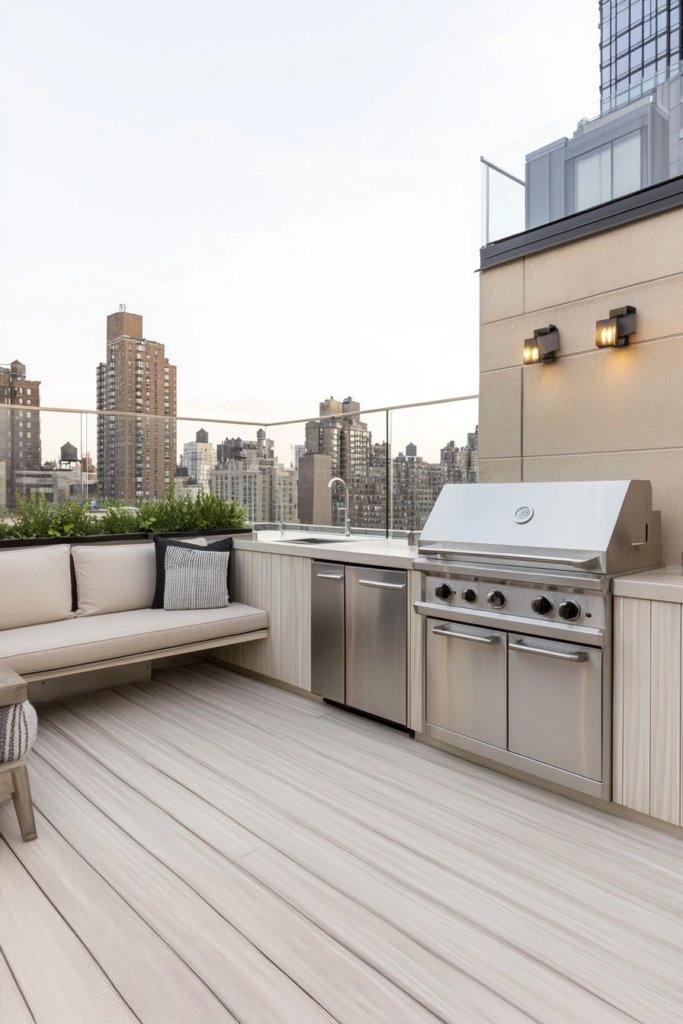 A sleek rooftop kitchen with stainless steel appliances, glass railings, and a minimalist monochrome palette. LED accent lighting enhances the urban sophistication. Use modern furniture for a sleek finish.