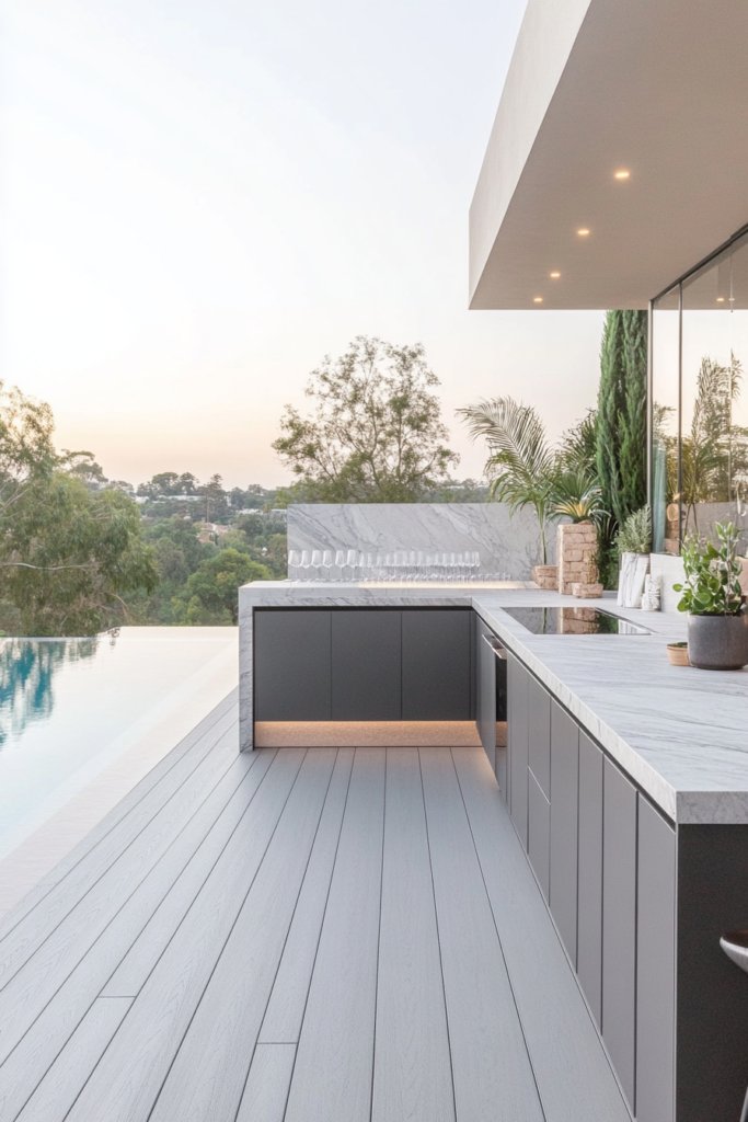 A sleek grey deck with marble countertops, a built-in LED-lit bar, and a stunning infinity pool backdrop. High-end finishes complete the look. Use contemporary furniture and soft ambient lighting for a sophisticated touch.