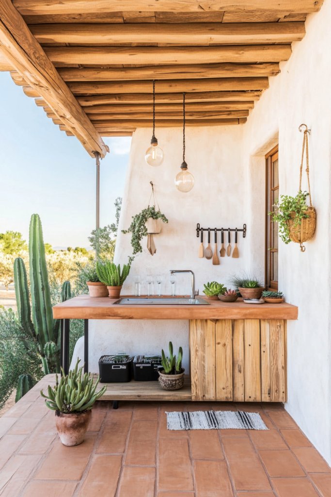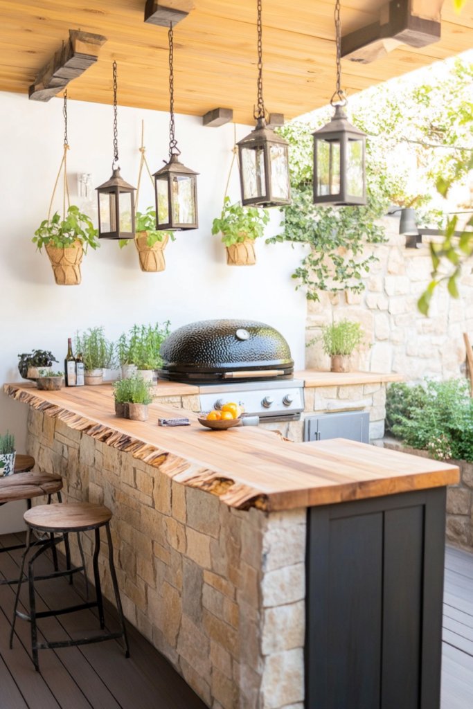 A warm, earthy outdoor kitchen with a stone-clad grill island, live edge wood countertops, and vintage lantern lighting. Add hanging planters and neutral decor for a natural touch.