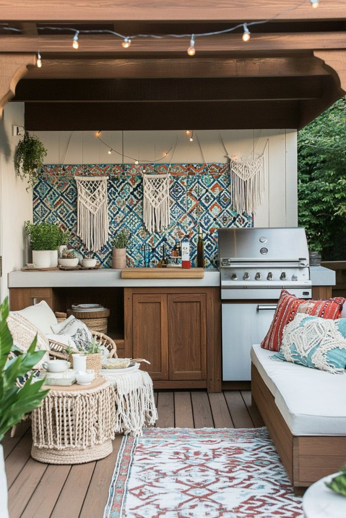 A colorful and inviting outdoor space featuring a reclaimed wood deck, Moroccan tile backsplash, and macramé decor. Cozy lounge seating and fairy lights complete the look. Layer patterns and vibrant textiles for a lively aesthetic.
