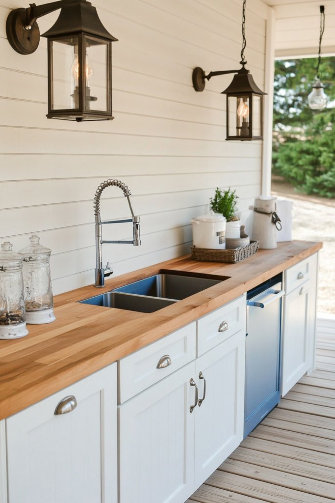 A reclaimed barn wood deck with shiplap paneling, butcher block countertops, and vintage lantern lighting exudes farmhouse warmth. Use a rustic blue and white color scheme for added charm.