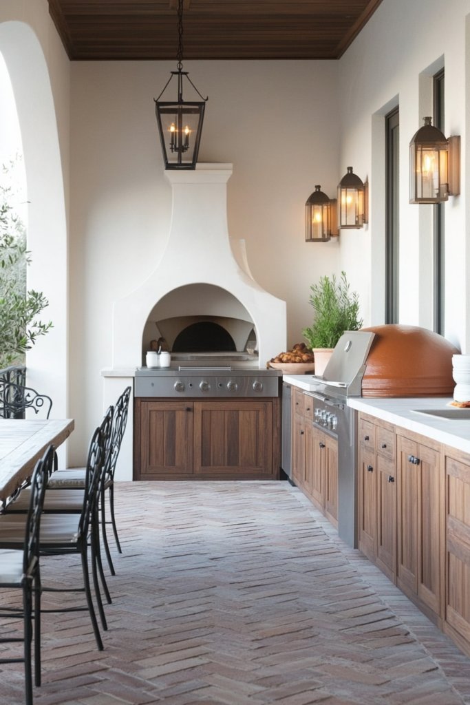 A warm and inviting design featuring a herringbone brick deck, a custom-built clay pizza oven, and rustic wrought iron details. Wooden cabinetry and soft golden lighting add charm. Complement with terracotta pots and mosaic tile accents.