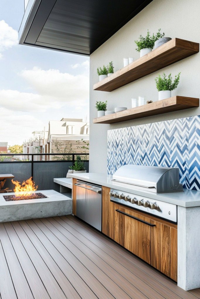 A bold, industrial-inspired design with floating shelves, sleek stainless steel countertops, and a contemporary fire pit. Geometric tile accents and a cool gray-blue palette add a modern flair. Pair with minimalist decor for balance.