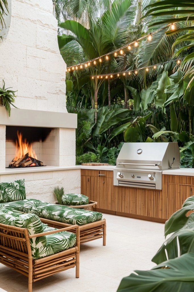 A white stone fireplace and bamboo seating with green palm-leaf cushions create a lush tropical vibe. Opposite, a stainless steel grill built into teak cabinetry is surrounded by dense foliage and illuminated by warm string lights, offering a relaxing island-inspired retreat.
