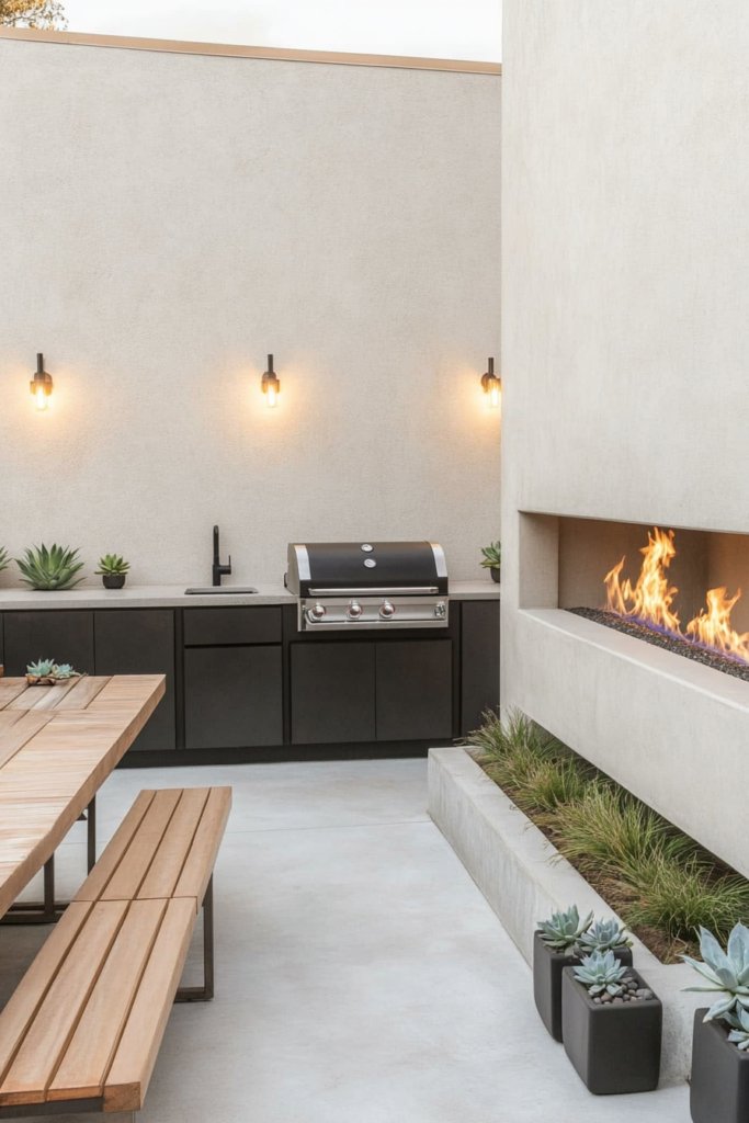 This minimalist space features a smooth concrete fireplace at one end, with sleek wooden bench seating opposite a matte black grill and sink setup. Simple planters filled with succulents and subtle wall-mounted lighting create a clean, calming ambiance.
