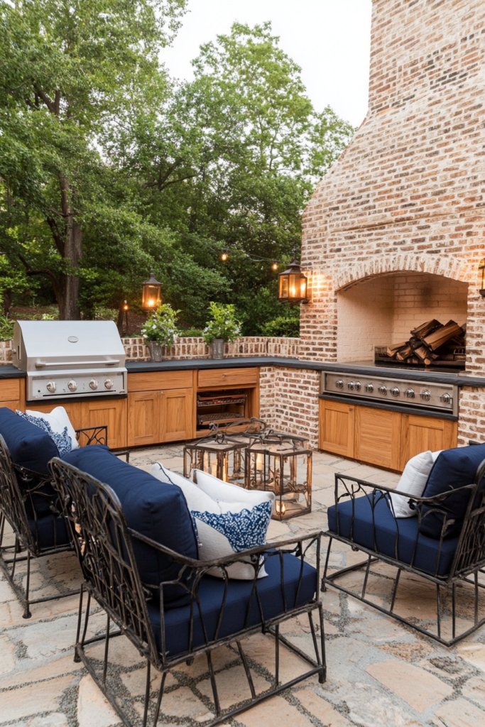 A grand cobblestone fireplace sets a classic tone for this traditional outdoor kitchen. Wrought-iron seating with navy cushions surrounds a brick-clad BBQ area, complete with built-in wooden cabinetry and ambient lantern lighting for timeless elegance.