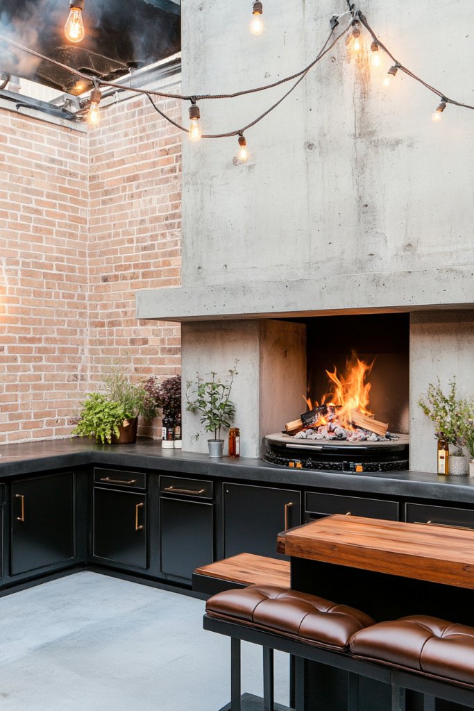 This edgy industrial space features a concrete fireplace with metal detailing and low-profile leather seating. A charcoal grill setup with dark metal cabinetry and wood countertops sits opposite, surrounded by exposed brick walls and illuminated by Edison bulb lighting for a modern, urban aesthetic.