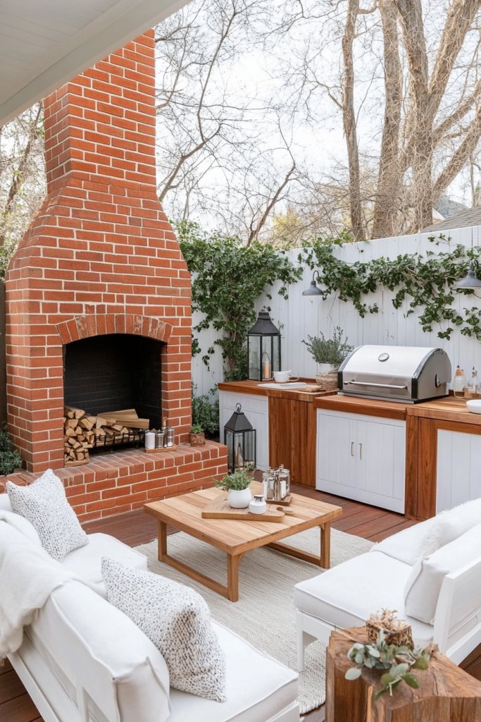 A charming red brick fireplace stands out in this farmhouse design, paired with white-painted wooden seating and soft throws. Opposite, a rustic grill area features wooden counters, a farmhouse sink, and vintage lanterns, all framed by climbing ivy for a touch of country charm.