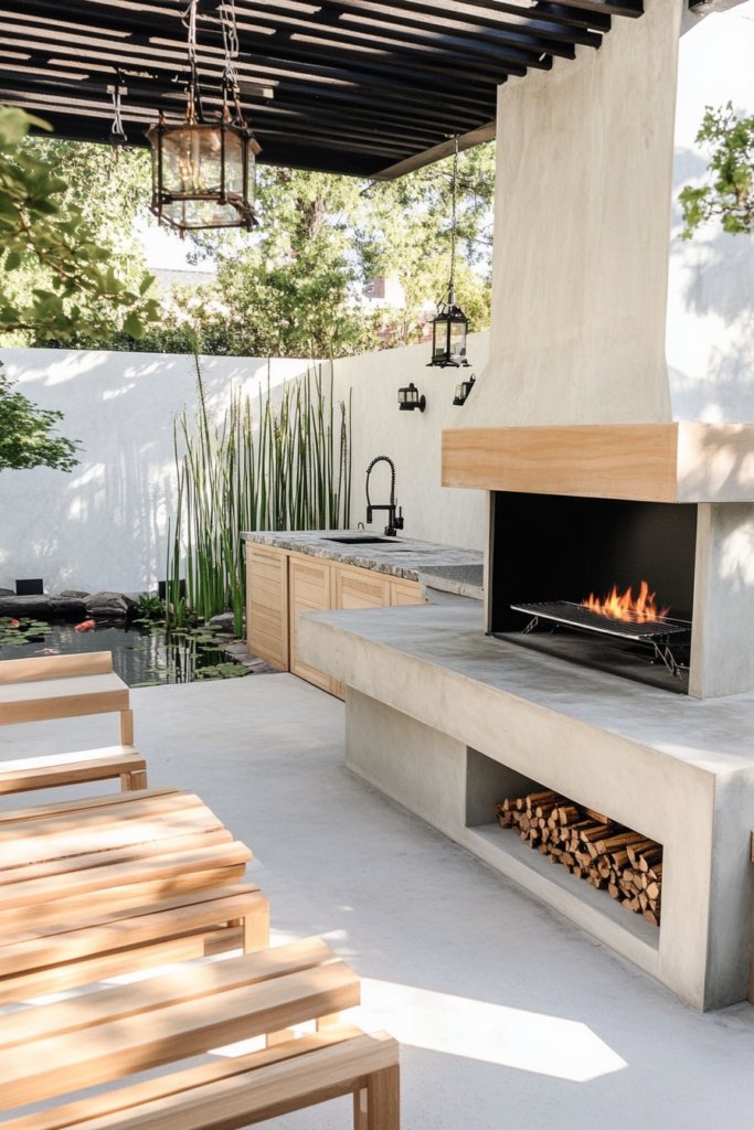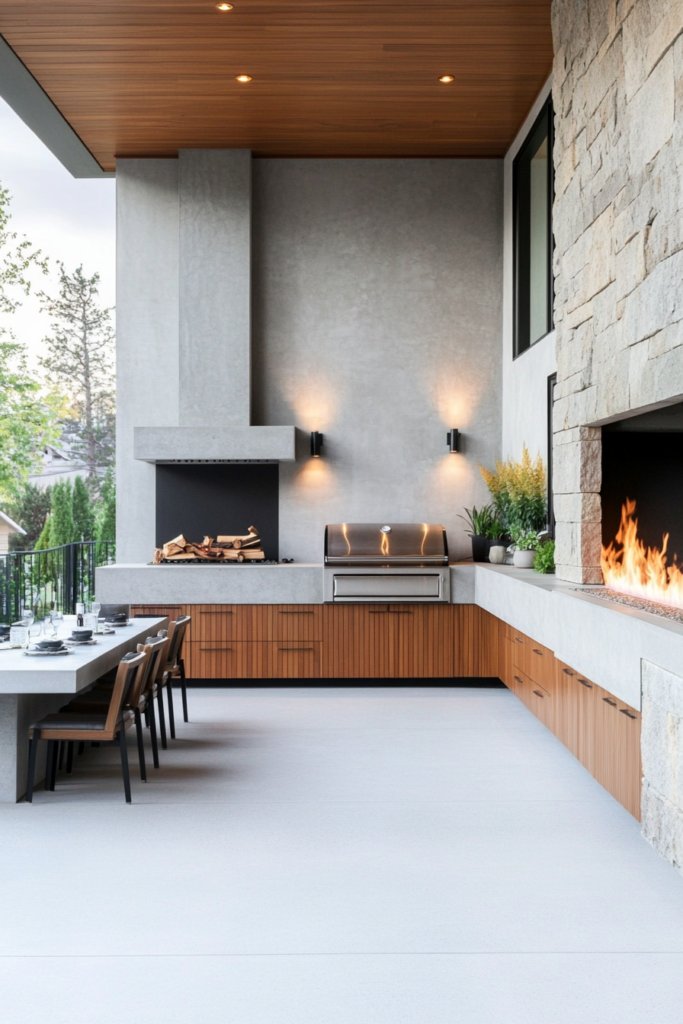 16. Minimalist Outdoor Kitchen with Concrete Fireplace