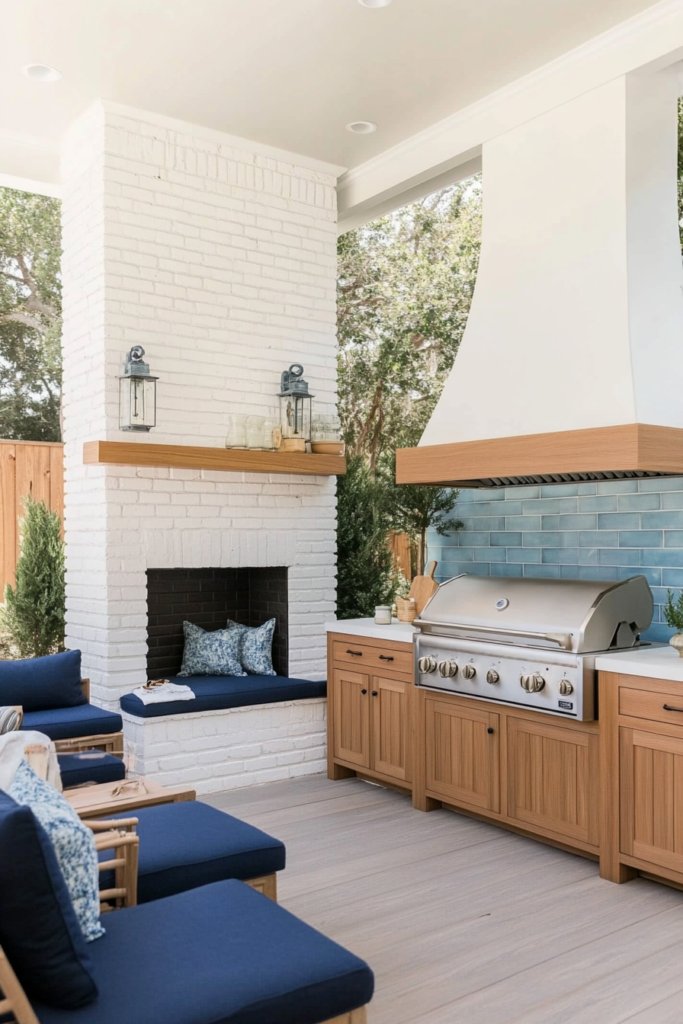A white brick fireplace complements the navy-blue cushioned seating in this relaxed coastal setup. Opposite, a built-in BBQ with driftwood-style cabinetry adds a beachy touch, while sea glass décor and soft blue tile accents evoke a calming seaside atmosphere.