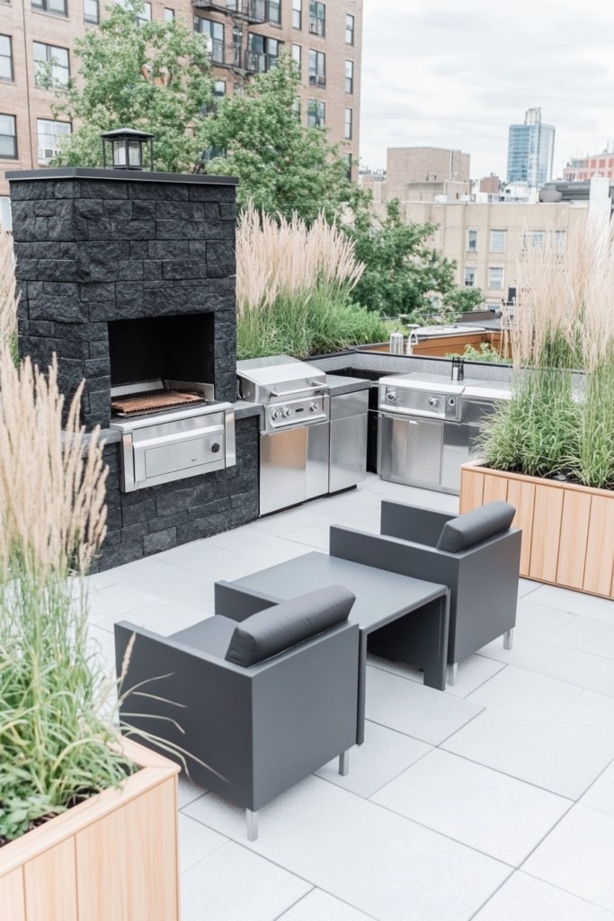 This sleek rooftop setup features a black stone fireplace surrounded by contemporary gray seating. A compact stainless steel kitchen with a built-in grill sits opposite, while tall grass-filled planters frame the space, blending urban sophistication with natural elements.