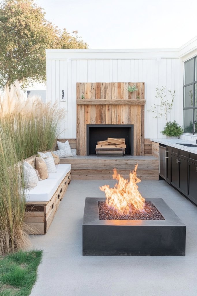 A reclaimed wood fireplace anchors this modern farmhouse space, featuring built-in seating around a cozy fire pit. Opposite, a sleek black steel kitchen with white marble countertops blends rustic and contemporary elements, complemented by tall grasses and minimalist landscaping.