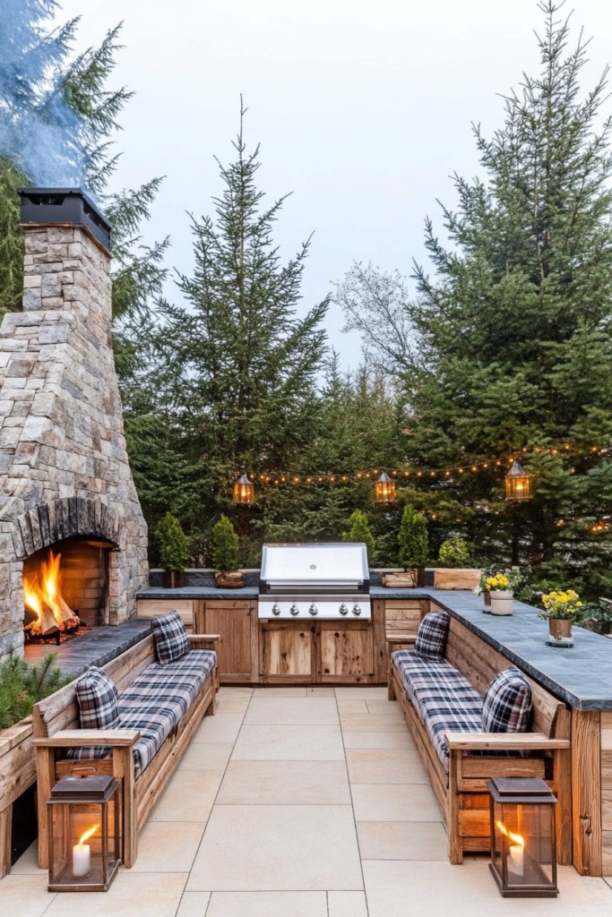 A large stone fireplace anchors this rustic space, enhanced by wooden seating with plaid cushions. Opposite, a BBQ area built from weathered wood and slate complements the surrounding pine trees, with soft lantern lighting adding a warm, cozy glow.