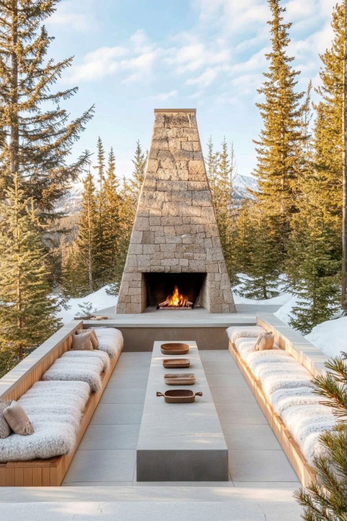 A grand stone fireplace anchors this cozy retreat, surrounded by snow-dusted evergreen trees. Wool-covered seating offers warmth and comfort, opposite a heavy timber grill station accented with copper finishes. The rustic charm and natural textures blend perfectly with the mountain setting for an inviting, high-altitude dining experience.