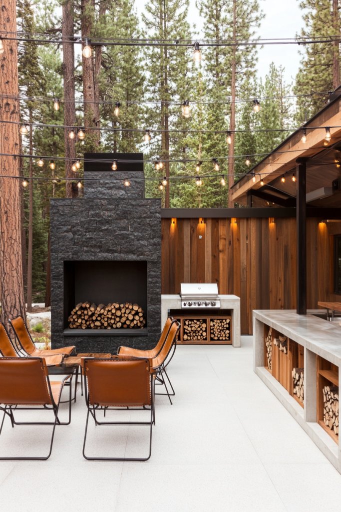 This forest retreat features a black stone fireplace with built-in wood storage, surrounded by leather sling chairs. A polished concrete BBQ area with wood accents sits beneath string lights, creating a cozy yet modern rustic space perfect for evening gatherings.