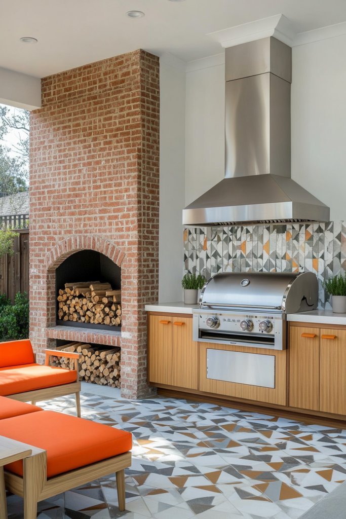A retro brick fireplace with a built-in wood storage niche adds vintage flair to this mid-century modern space. Bright orange cushions on retro-style seating contrast with a stainless steel grill setup and teak cabinetry, all set against geometric tile flooring for a playful, nostalgic touch.