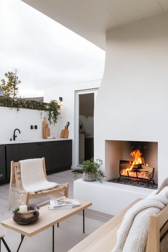 21. Scandinavian-Inspired Outdoor Kitchen with White Stone Fireplace