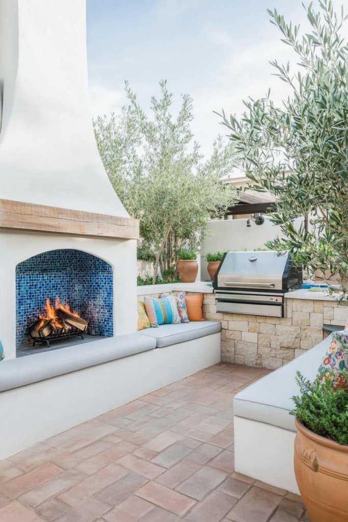 A white stucco fireplace decorated with blue mosaic tiles sets the stage for this vibrant space. Built-in bench seating with colorful cushions and a stone-clad BBQ area are framed by terracotta flooring and large clay pots filled with olive trees for authentic Mediterranean charm.