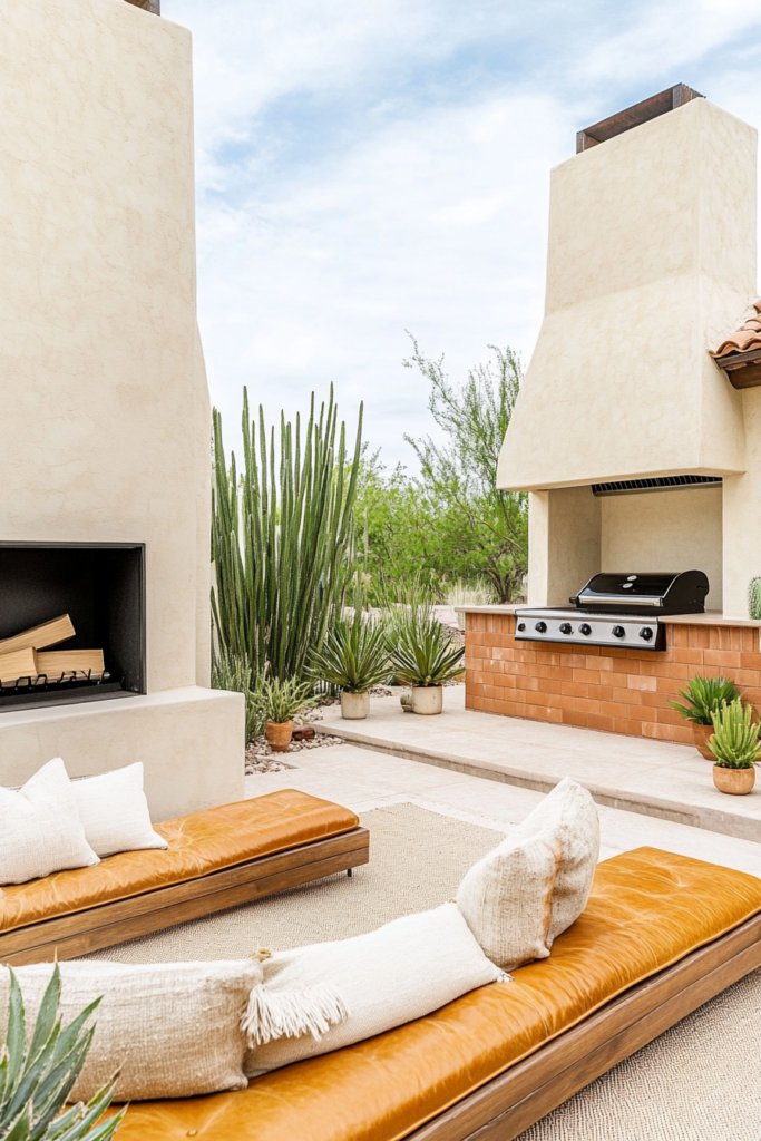 A minimalist stucco fireplace offers warmth in this desert-inspired space. Low wood-and-leather seating pairs with a BBQ island clad in terracotta tiles, surrounded by agave, cacti, and that complete the arid, Southwestern vibe.