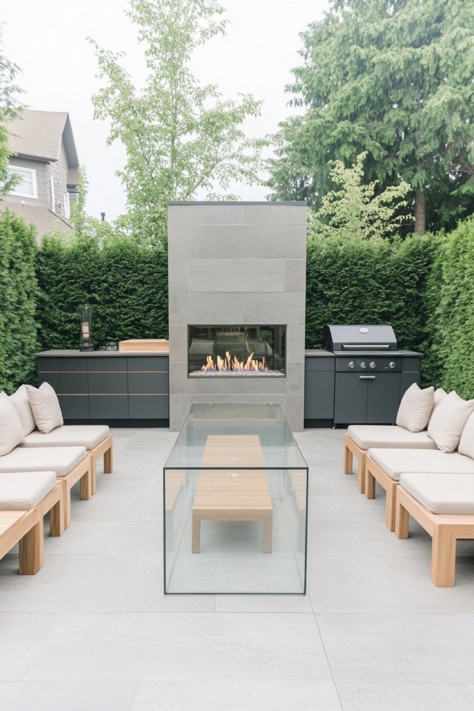 A sleek glass-enclosed fireplace provides modern sophistication, paired with low-profile seating in neutral tones. The opposite side features a streamlined BBQ station crafted from dark gray metal and wood, surrounded by tall privacy hedges for seclusion. This space blends urban minimalism with luxurious comfort.