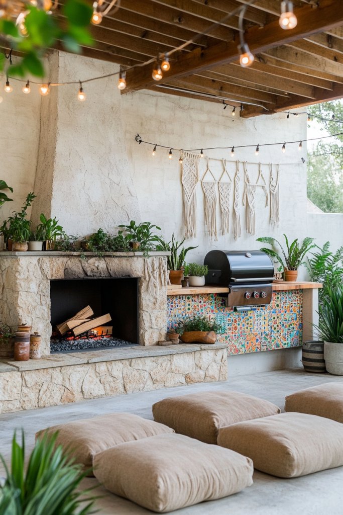 A rustic stone fireplace serves as the centerpiece of this bohemian haven. Low pouf seating surrounds the space, while a handcrafted BBQ area adorned with colorful mosaic tiles sits opposite. String lights overhead, macramé hangings, and potted plants fill every corner, creating a vibrant, eclectic ambiance.