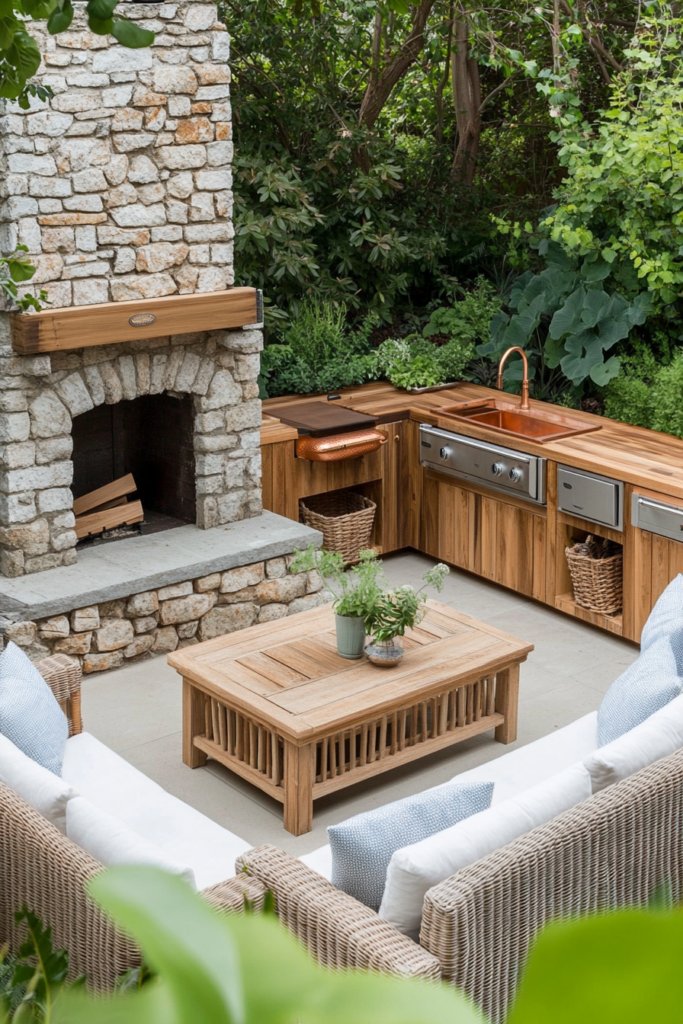 A stacked stone fireplace brings warmth to this rustic space, paired with wicker seating and plush cushions around a wooden coffee table. Opposite, a grill area built into reclaimed wood counters features a copper sink, surrounded by lush greenery for a natural, welcoming feel.