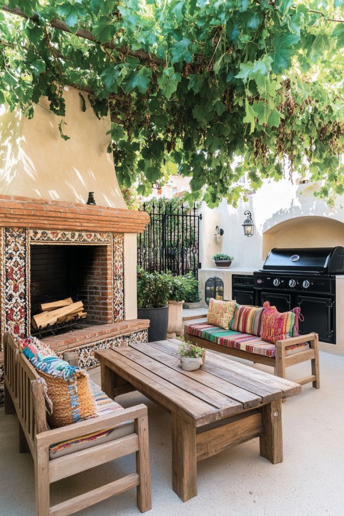 This vibrant Spanish-style kitchen features a terracotta brick fireplace adorned with decorative tiles. Rustic wood seating with colorful woven cushions faces a stucco BBQ area with wrought-iron detailing, while lush hanging vines overhead complete the warm, inviting space.