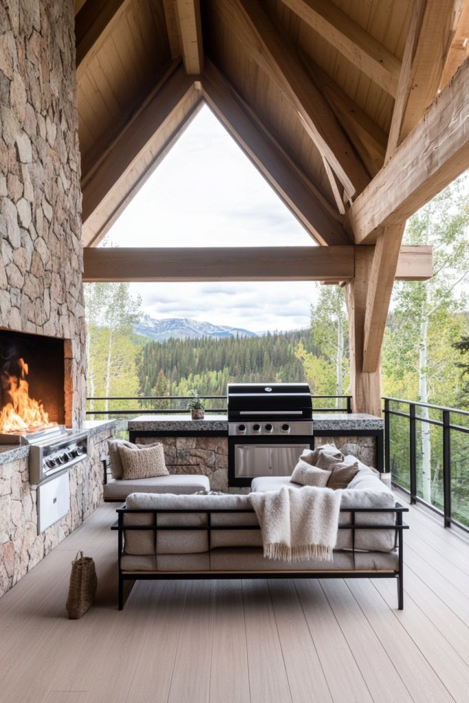 Framed by natural wood beams, a large stone fireplace becomes the heart of this mountain retreat. Cozy sectional seating with wool throws invites relaxation, while a high-end grill built into a granite island offers stunning views of the surrounding forest, blending luxury with rustic charm.