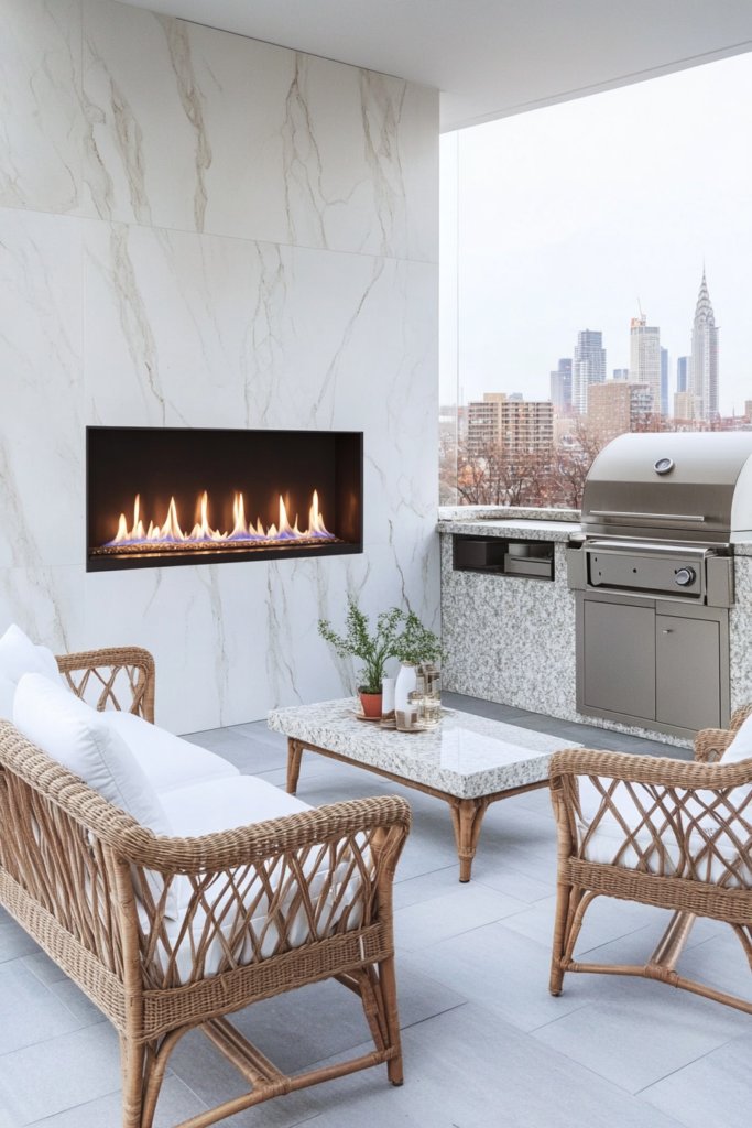 A modern linear gas fireplace set in a marble wall adds elegance to this luxurious space. Rattan seating with crisp white cushions sits opposite a high-end grill and granite outdoor bar, offering spectacular views of the city skyline—a perfect blend of sophistication and comfort.
