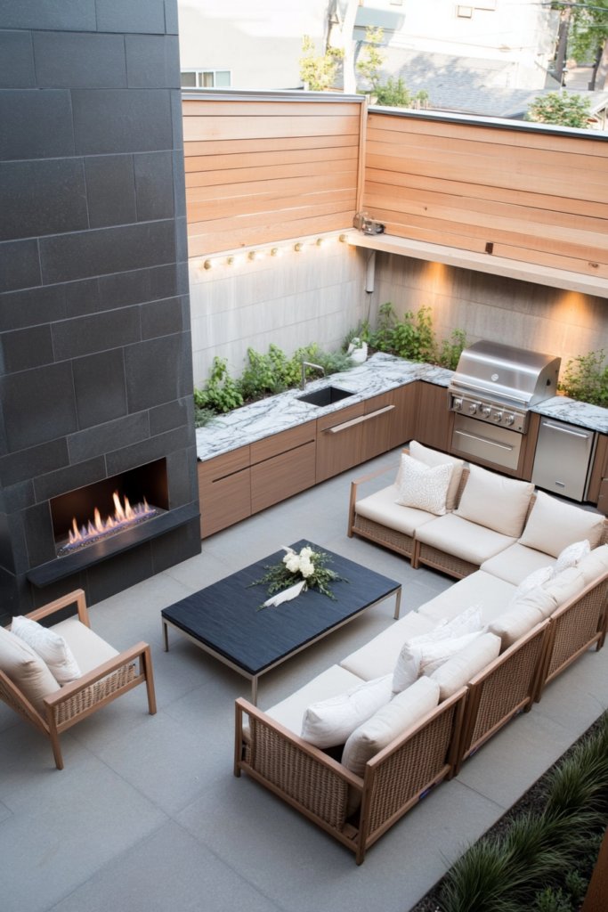 3. Chic Urban Outdoor Kitchen with Glass Fireplace