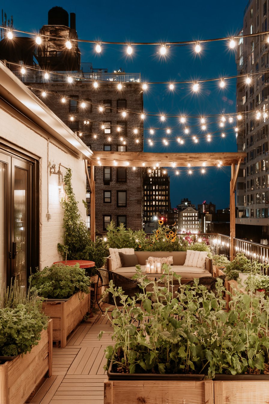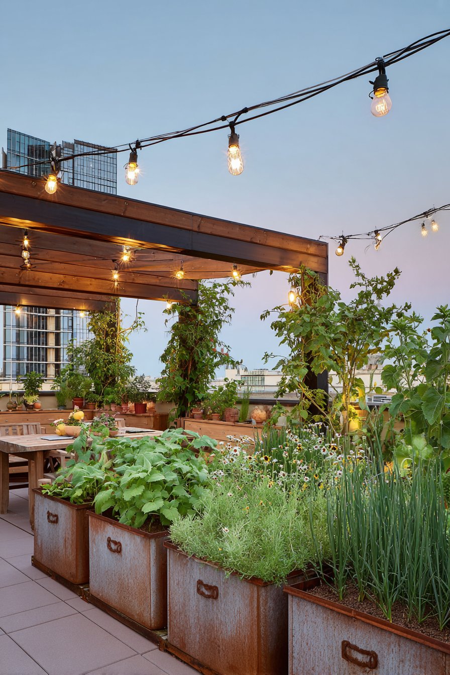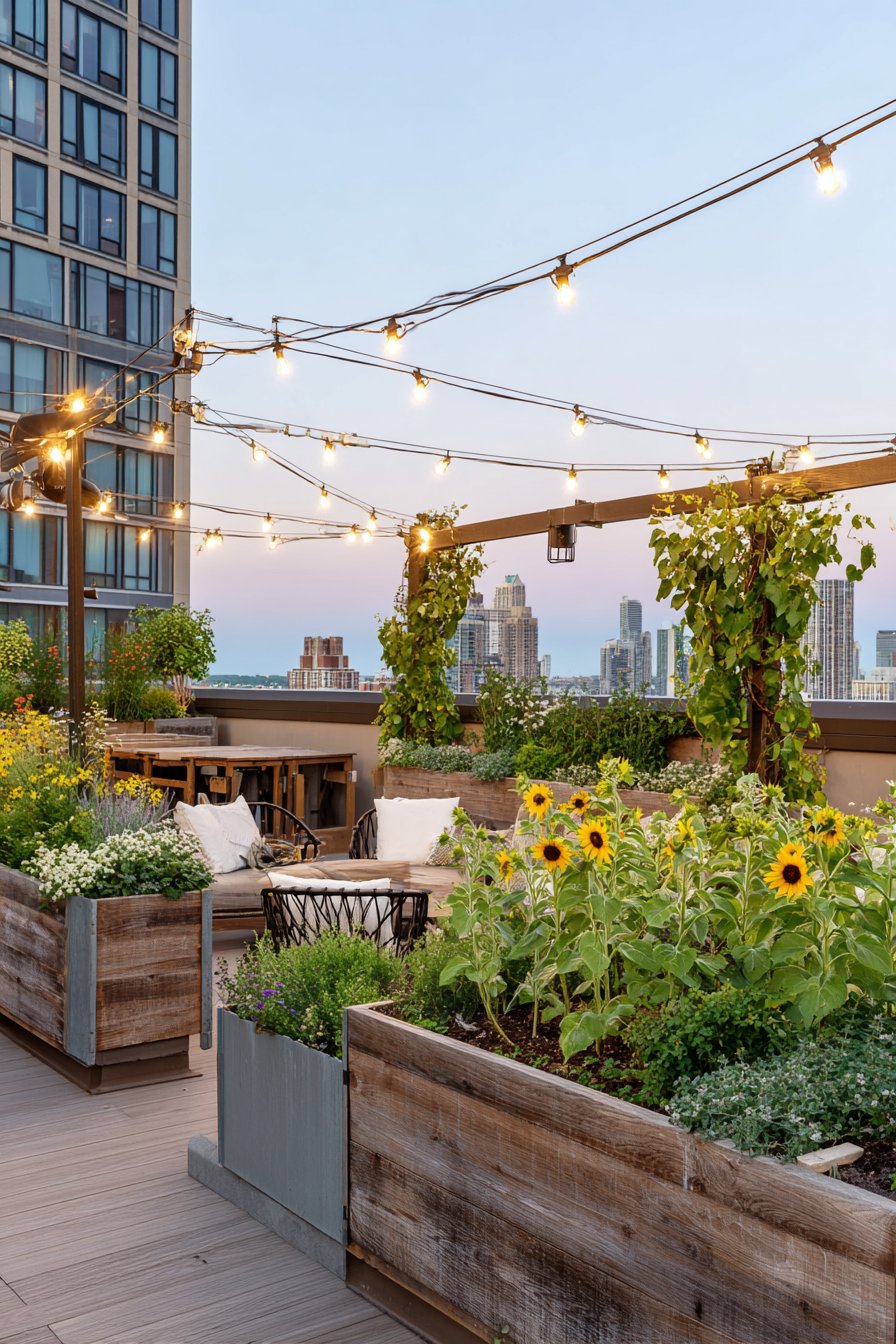String lights create a warm, inviting atmosphere, beautifully enhancing the cozy seating area surrounded by lush greenery in wooden planters. To achieve a similar look, incorporate soft lighting and a mix of vibrant plants for texture and color.