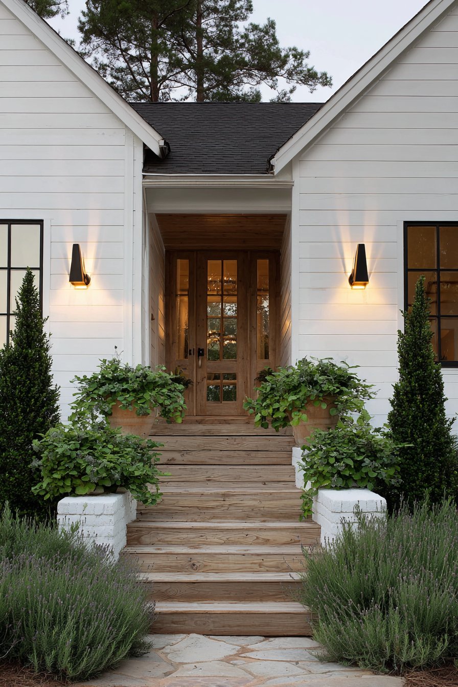 The warm glow of modern sconces beautifully accentuates the lush greenery and textured planters, creating an inviting entrance. To replicate this look, incorporate layered lighting and choose a mix of vibrant and subtle foliage for visual interest.