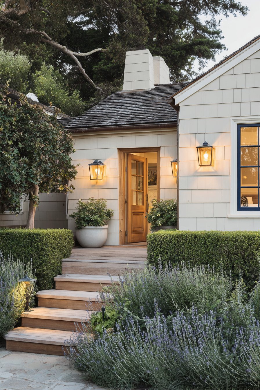 Warm lanterns cast a gentle glow along a wooden pathway, beautifully accentuating the lush lavender and neatly trimmed hedges in soft green hues. To replicate this serene atmosphere, choose warm-toned lighting and incorporate fragrant plants for both visual appeal and a delightful scent.