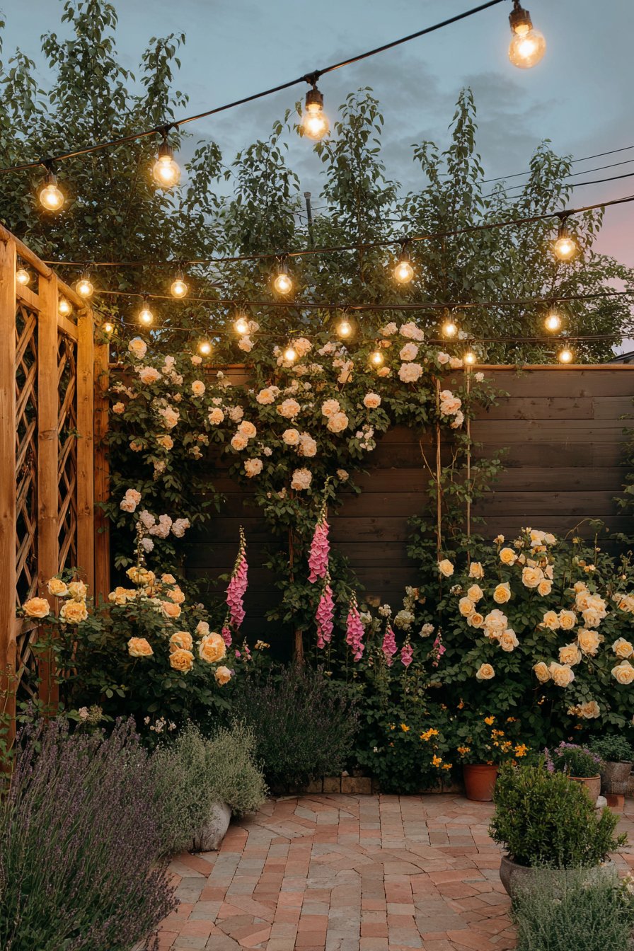 String lights elegantly drape over a vibrant mix of blooming roses and foxgloves, creating a whimsical atmosphere perfect for evening relaxation. To replicate this charm, incorporate soft lighting and a variety of colorful, alongside cozy seating in your garden.