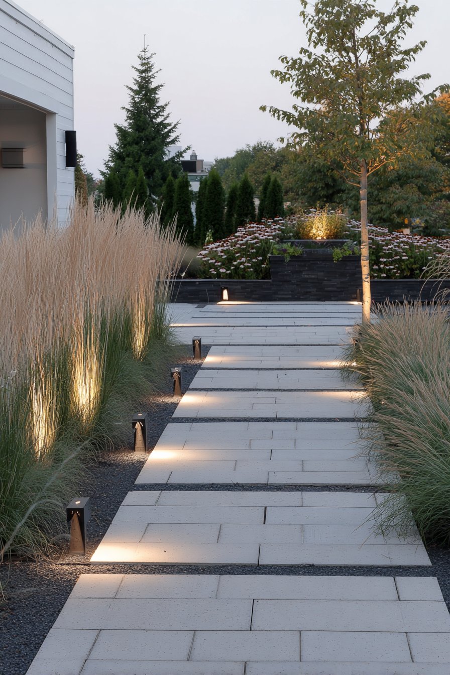 The warm glow from strategically placed pathway lights highlights the sleek, modern pavers and the lush grasses, creating a serene nighttime ambiance. To achieve this look, incorporate low-voltage lighting along pathways and choose ornamental grasses for texture and movement.