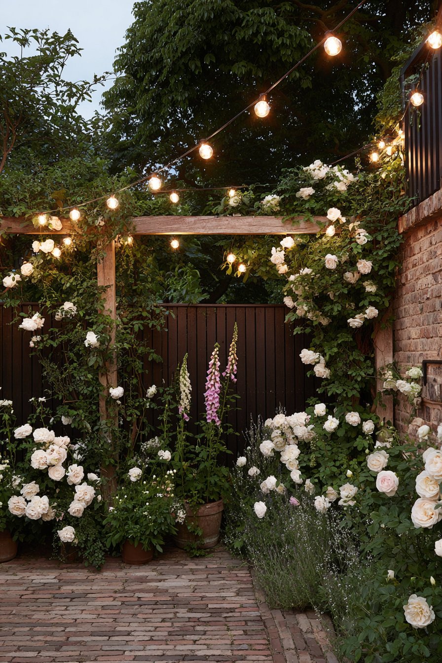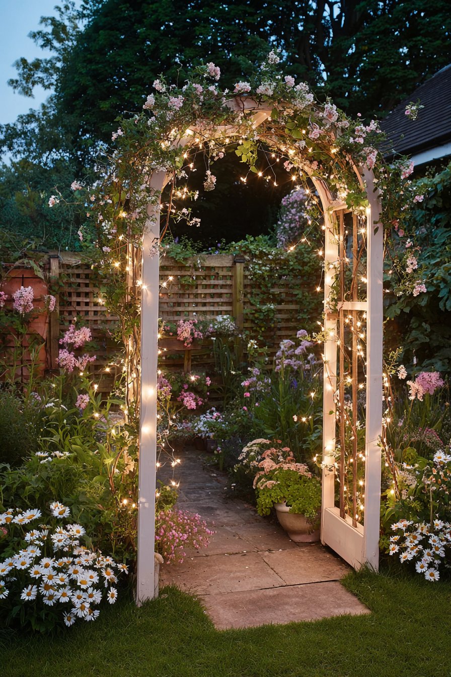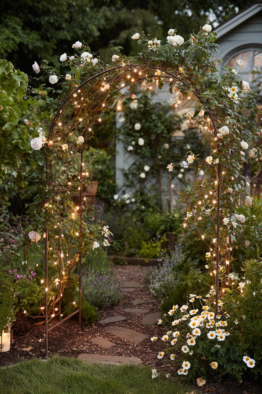 Twinkling fairy lights draped over an archway create a magical ambiance, while the soft white and pastel blooms add delicate color and texture. To achieve a similar look, use climbing or fragrant vines with warm lighting to enhance your garden’s enchanting atmosphere.