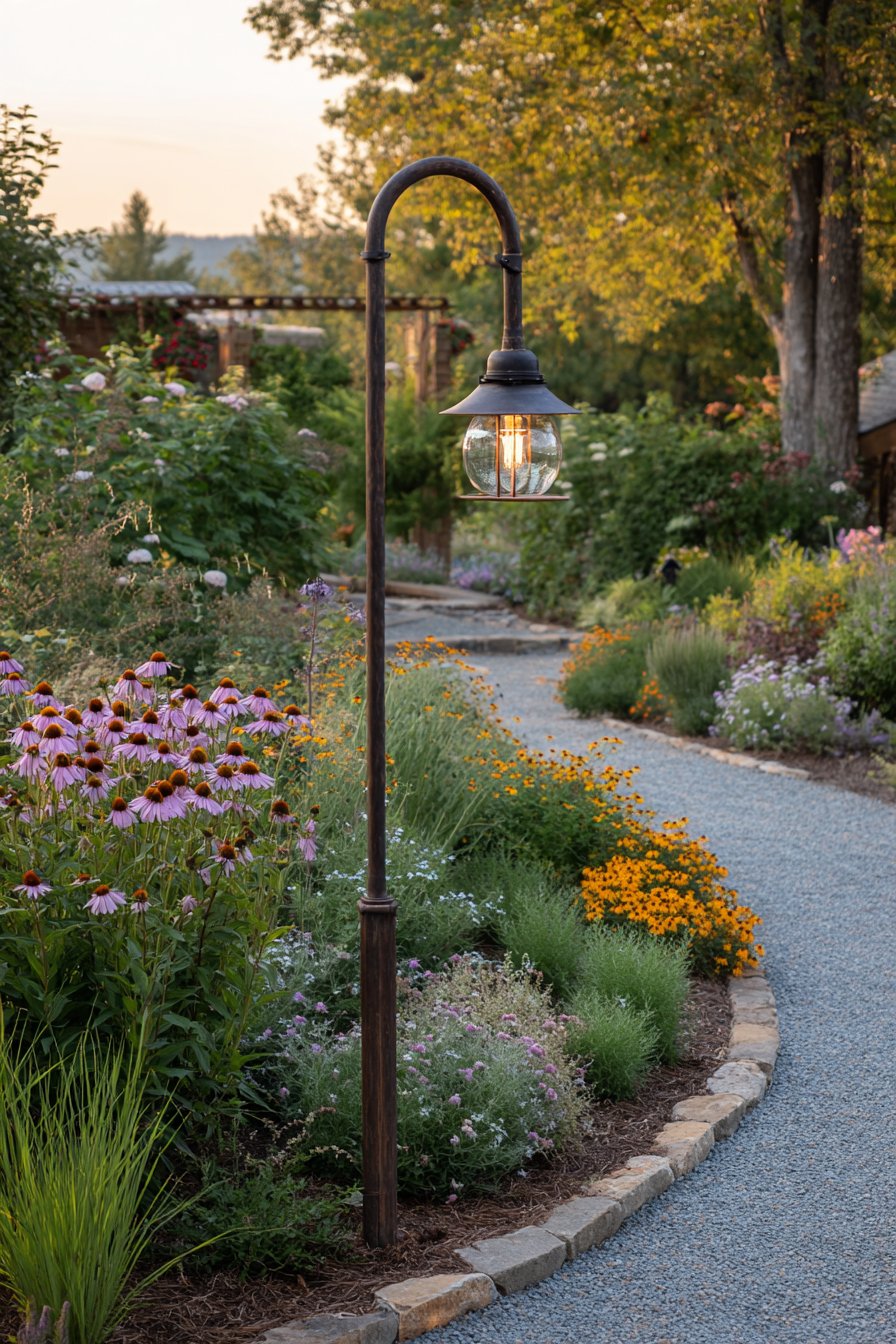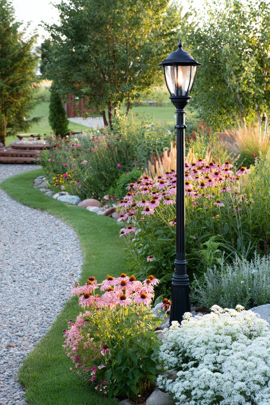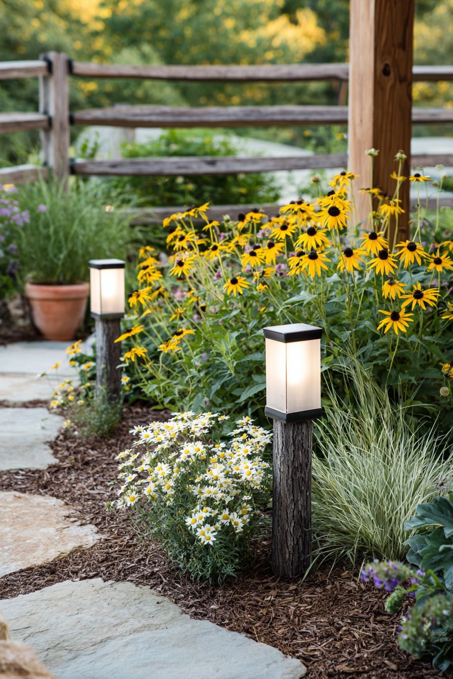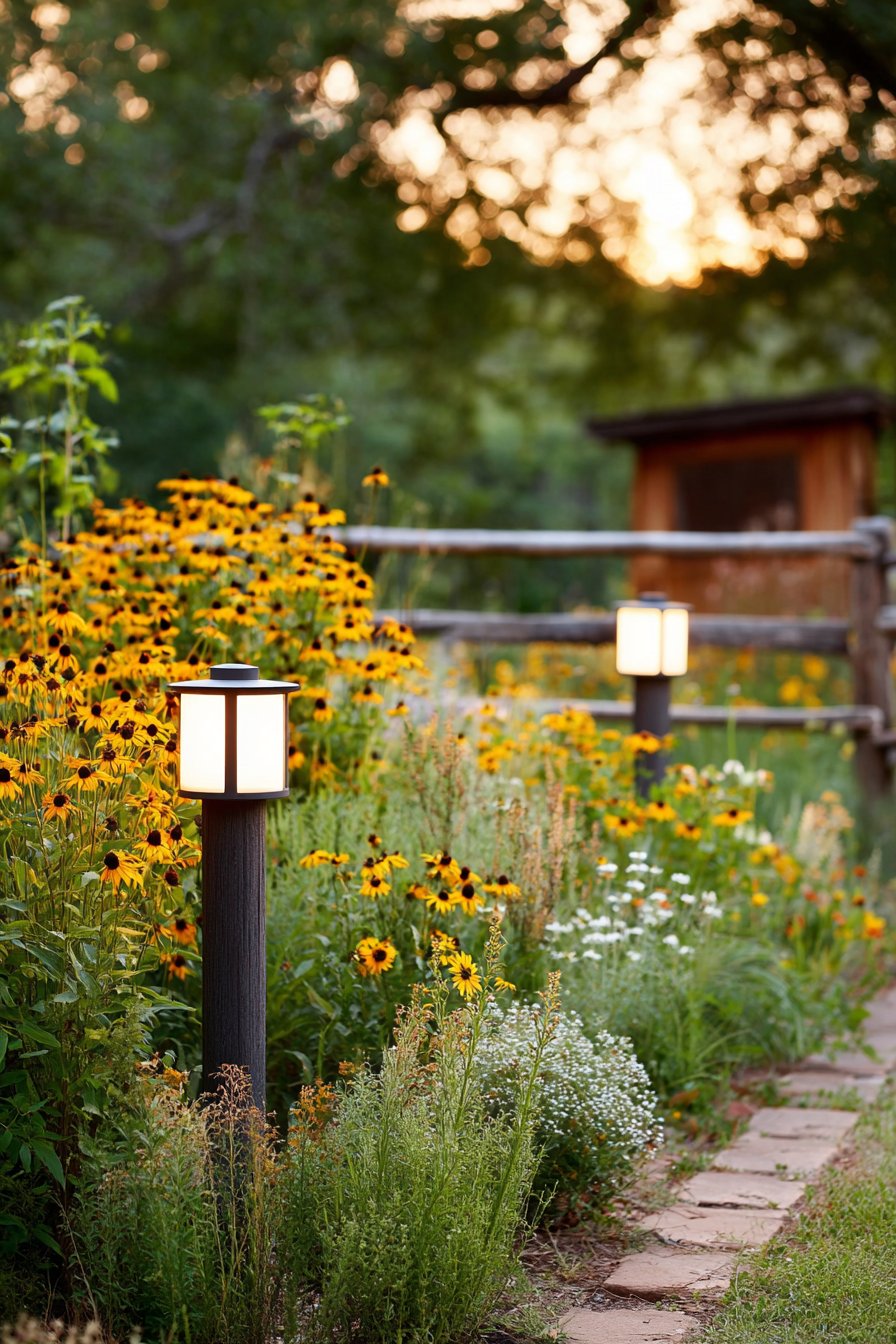 The warm glow of rustic lantern-style lighting beautifully complements the vibrant hues of coneflowers and black-eyed Susans, creating an inviting atmosphere. To achieve this look, combine varied textures in your planting and use soft, ambient lighting along pathways to enhance evening strolls.